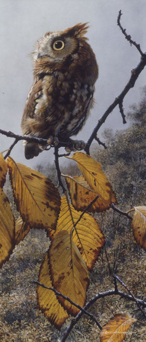 This painting was done as a tribute to a little screech owl as well as to his caretaker, Michelle, whom I know from a bird rehabilitation center in Ohio. The owl has beautiful reddish-brown feathers and very expressive eyes; therefore, they named him Fireball.