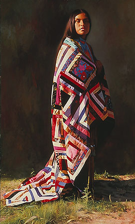 "We had seen the young lady in this painting participating in a ceremonial dance on the San Carlos Apache Reservation. We were struck with her elegance, dignity and natural grace and asked her to pose for us. Knowing the Apache love of vivid color, this unusual old blanket seemed just the right element to enhance those qualities."