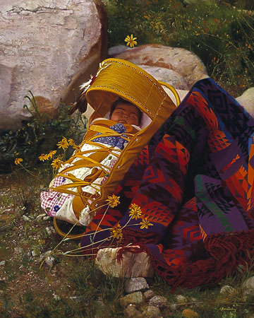 "The first thing I noticed about this charming scene was the colorful and unique cradleboard," relayed artist Don Crowley. "Each tribe has its won design and this is an Apache cradleboard, naturally, since the baby is Apache and only a few month's old. Adding to the atmosphere is the colorful Pendleton blanket, an item commonly found at the trading post on the reservation. Every family has two or three of them. The flowers around the cradleboard are brittlebush."