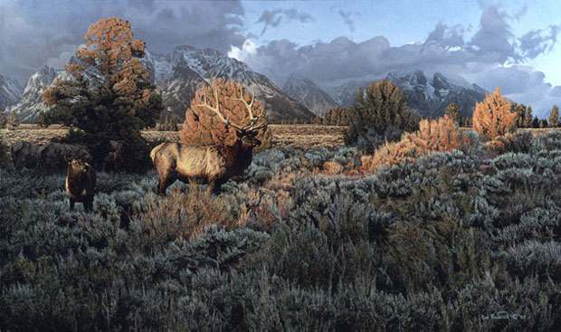 In the late fall, a bull elk (wapiti) leads his harem down from their summer feeding range. Some in the herd feed while the others are on alert, perhaps seeing or hearing something. The warm glow of the morning sun is breaking up the shadows that have been protecting the herd and the elk will likely return to the shadows and thicker woods as the day progresses. But for these few moments, their splendor is enhanced by the first rays of the morning sun. - Rod Frederick
