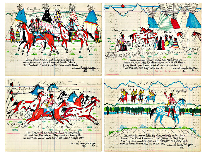 The tale of the one of Daniel Long Soldier’s warrior forefathers is the subject of these Lakota Wicitowa (Lakota Paintings), created on 19th century ledger paper and faithfully reproduced in this four-piece Fine Art Edition. The naïve drawing style on an authentic 1800’s ledger immediately raises the question of whether or not we are looking at something created 150 years ago or today. This fine art suite is as authentic a piece of Great Plain’s history as any collector of the Native American experience could own.