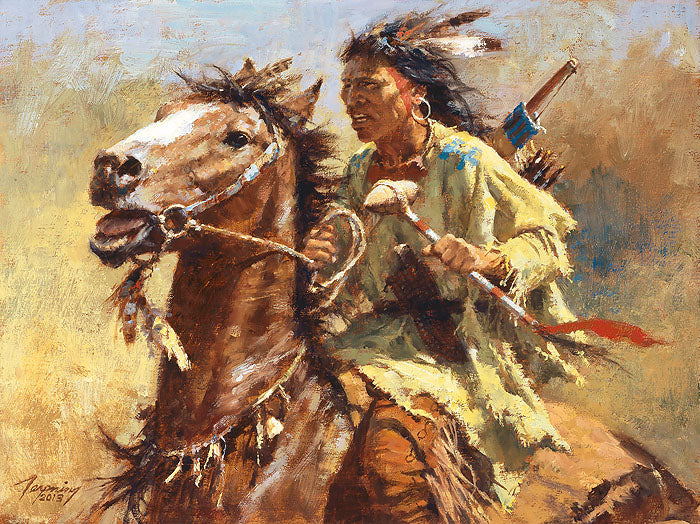 “Among the Plains warriors, the war chief became a leader because of his proven success in battle,” relates Howard Terpning. “If his war party's returned to camp victorious, he would have an easier time recruiting warriors to participate in subsequent raids. These men were very brave and fierce which is the feeling that I tried to portray in this painting.”