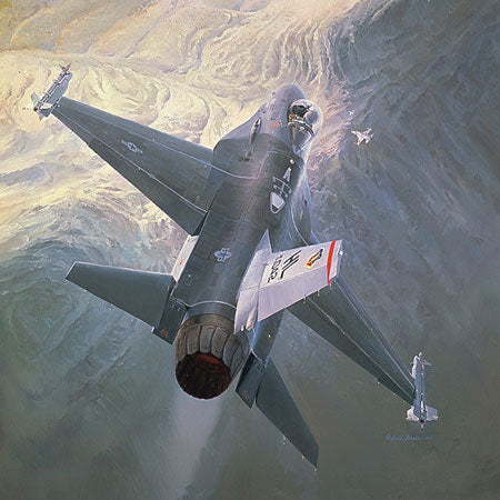 The action takes place on a training mission over the Nellis Range north of Las Vegas. I chose the afterburner view of the plane for several reasons: first, because it emphasizes the fantastic 25,000-pound thrust engine. The viewer can see all of the control inputs - elevators, rudder, 'flaperons' and leading edge flaps. It also shows off the unit markings, armaments and the 360-degree view the pilot has from his bubble canopy. This F-16 is rolling opposite his opponents' line of flight. The pilot will outmaneuver the two 'aggressor' F-5's below by staying inside their turn . . . and emerge the victor in this 'Sunrise Encounter.'"