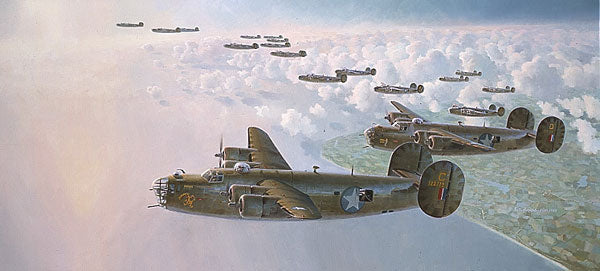"The Circus Outbound" conveys the power of eighteen B-24Ds of the American pioneer 93rd Bomb Group as they climb through 21,000 feet into the light of the early morning sun. On this important day of World War II (March 18, 1943), the B-24Ds, joined by B-17s and other bombers, crossed the East Coast of England en route to their target, the submarine base at Vegesack, Germany. This first mission to Germany for the 93rd Bomb Group proved that daylight bombings could be carried out successfully in the face of German defenses.