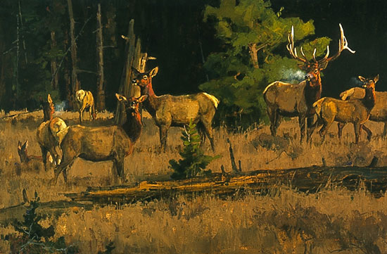 A strange sound penetrates the forest, drawing the attention of the grazing harem of elk. The majestic old bull maintains a cautious but confidant stance while his youngest mate, his concubine, strikes a timid pose as she is introduced to his herd.