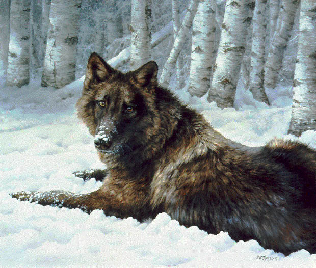 "Wolves have a very playful nature and nothing brings that out like a good, deep snowfall. They love to trench about through the snow with their noses and when they come up with a pile on their snouts, they're perfectly convinced they're covered - because that's what they see. Sniffing for mice, this big, black timber wolf feels he has camouflaged himself so we can't see him at all. See if you can find him . . . !"
