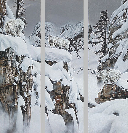 Mountain goats live in an up-and-down world that lends itself to the triptych form. "World of White" has a light, airy feeling, an Oriental quality blended with a North American subject. These mountain goats traverse cliffs and crags that are covered by the winter's first heavy snow. They are moving to an even higher, more precarious promontory where the wind has blown the snow off the mosses, lichens and grasses on which they forage.