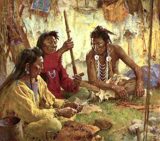Native Americans believed that there was a force that ruled nature. Using the pipe as a means of connecting with the great spirit, they would seek guidance from Mother Earth, the Four directions, and the Great Spirit above, to direct their course to a proper resolution of their problems. The Crow People also called pipe above, “The First Maker.” They held the bowl of the pipe down and passed it from left to right. Each person in turn saying a prayer. These Crow men are seeking guidance through the smoking of their medicine pipe. - Howard Terpning