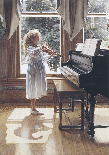 "We would all love our children to have a dream that would motivate them enough to do anything to achieve it. The first time the little girl in "Beginning" had ever held a violin was the day she modeled for this paintings. Years later, her mother and she came to see me and proudly told me that because of this painting, the daughter took up the violin and has now become a very accomplished violinist."