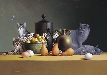 Braldt also could not resist a little play on words, giving a light twist to this formal piece. Three of the four “pairs” of the title are not the edible sort. Pictured are two California Spangled Tabbies, one silver, one brown; two Cymrics, one Mackerel Tabby with white, one tuxedo and two blue Turkish Angoras. The two mice make the forth (and tastiest) pair offered at this table.