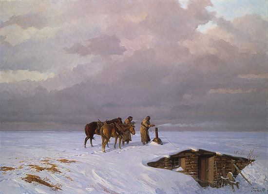 It is possible that, on a previous day, a Sioux hunter had observed the tell-tale plume of smoke and ridden across the high, open plains to investigate. Now he rides by with a companion to show him the homesteader's sod house and share with him the pleasure of this ready-made handwarmer. Obviously they find the concept pleasing. Perhaps this was followed later by an exchange of fresh meat for bread and coffee and eventual friendship.